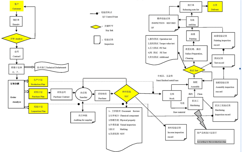 公司按照阀门标准设立有质量网络检测节点,实现检测项目全覆盖,生产过程层层把关。采取定岗定责、过程检查、质量考核、责任追究、质量追溯、数据统计分析等一系列行之有效的方法,做到关键工序重点控制、普通工序规范操作,通过对生产过程的全面控制和对关键节点的有效监督,提高了工作质量,保证了产品质量。